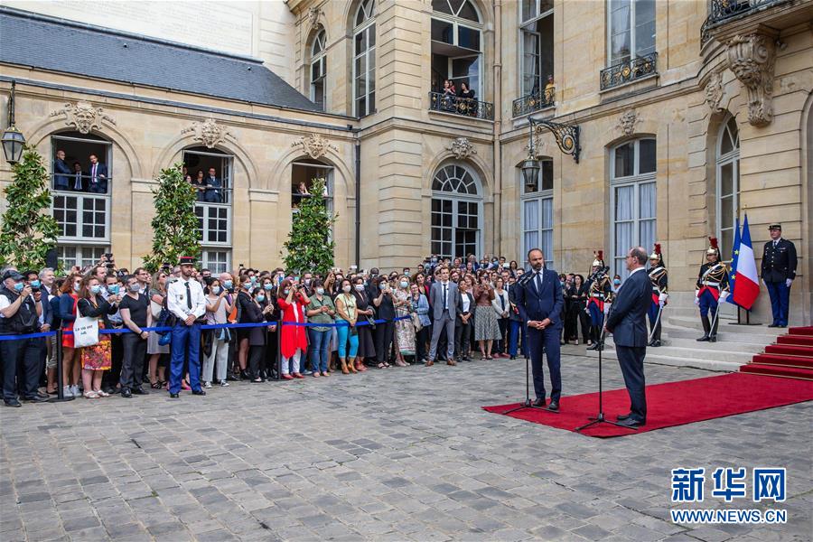 7月3日,在法國(guó)巴黎總理府,卸任總理愛(ài)德華·菲利普與新任總理讓·卡斯泰出席權(quán)力交接儀式。新華社發(fā)(奧雷利安·莫里薩爾 攝)