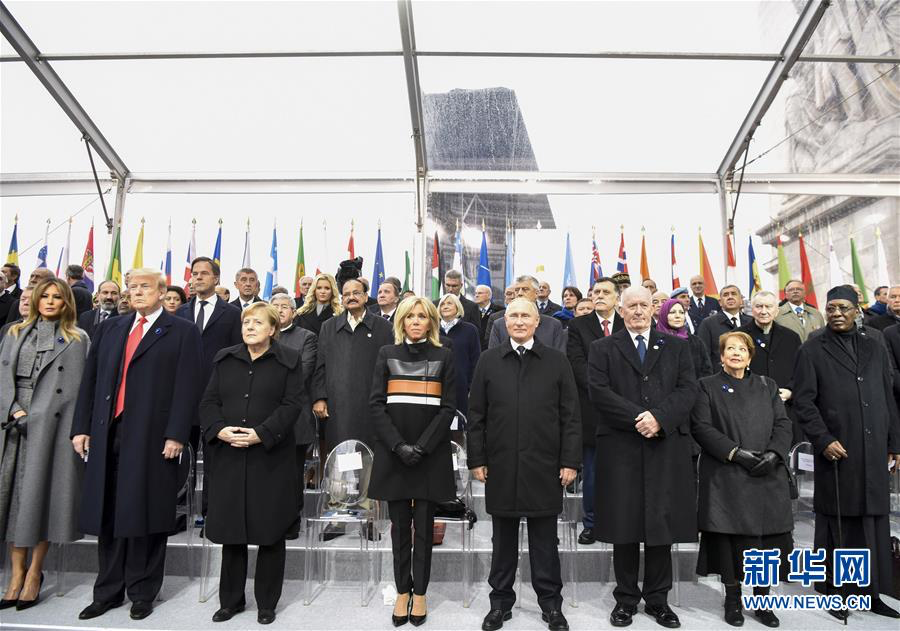 2018年11月11日,在法國巴黎,俄羅斯總統(tǒng)普京(前右四)、德國總理默克爾(前左三)與美國總統(tǒng)特朗普(前左二)出席紀念儀式。當日,法國政府在巴黎凱旋門前舉行儀式,隆重紀念第一次世界大戰(zhàn)結(jié)束一百周年。新華社記者 陳益宸 攝