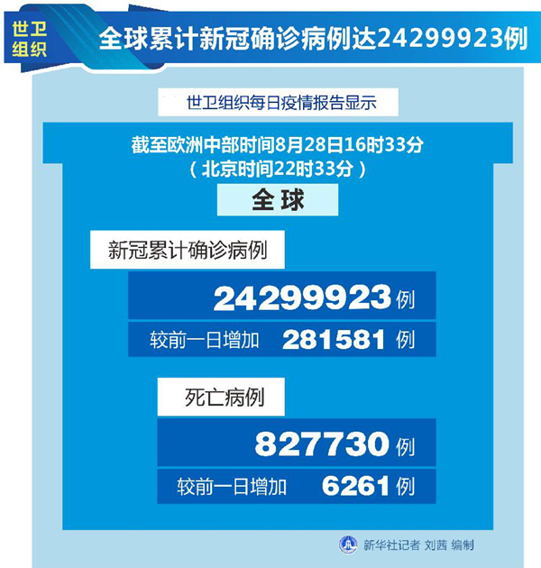新華社日內(nèi)瓦8月28日電(記者劉曲)世界衛(wèi)生組織28日公布的最新數(shù)據(jù)顯示,全球新冠累計確診病例達24299923例。