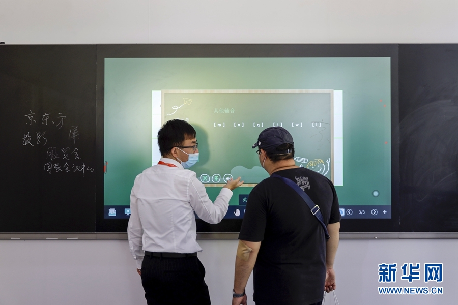 9月5日,一名男子在服貿(mào)會5G通信服務(wù)專題展區(qū)了解一款智慧黑板。此產(chǎn)品可實現(xiàn)普通黑板書寫、電子白板交互、數(shù)字資源調(diào)用、多媒體課件演示、音頻錄制、遠程交互及直播等功能。 新華社記者 李木子 攝