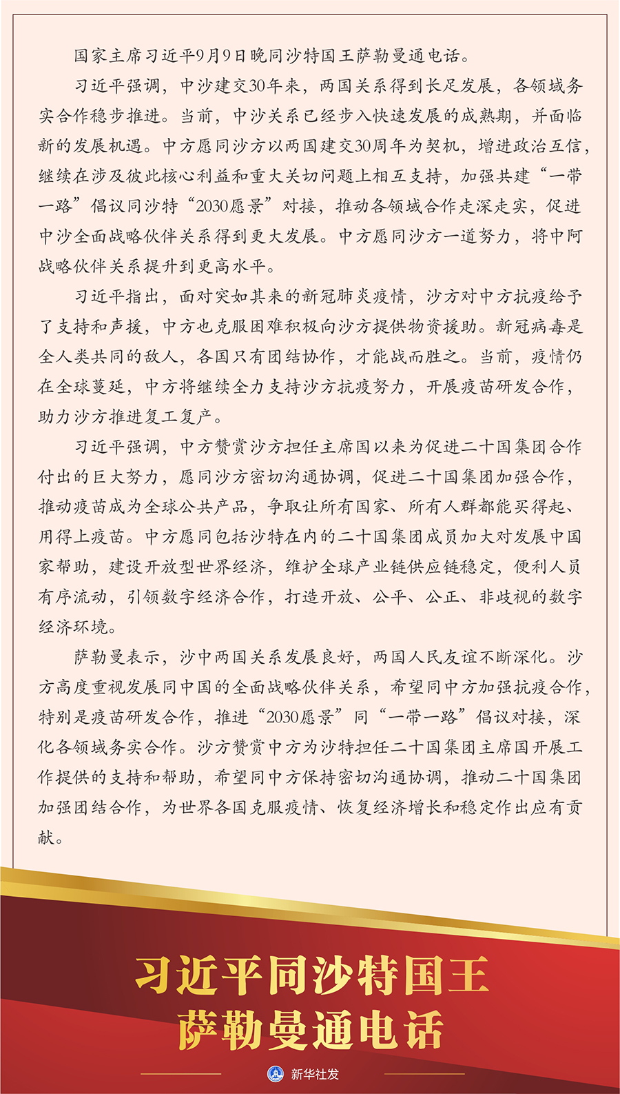 新華社北京9月9日電? 國(guó)家主席習(xí)近平9月9日晚同沙特國(guó)王薩勒曼通電話。