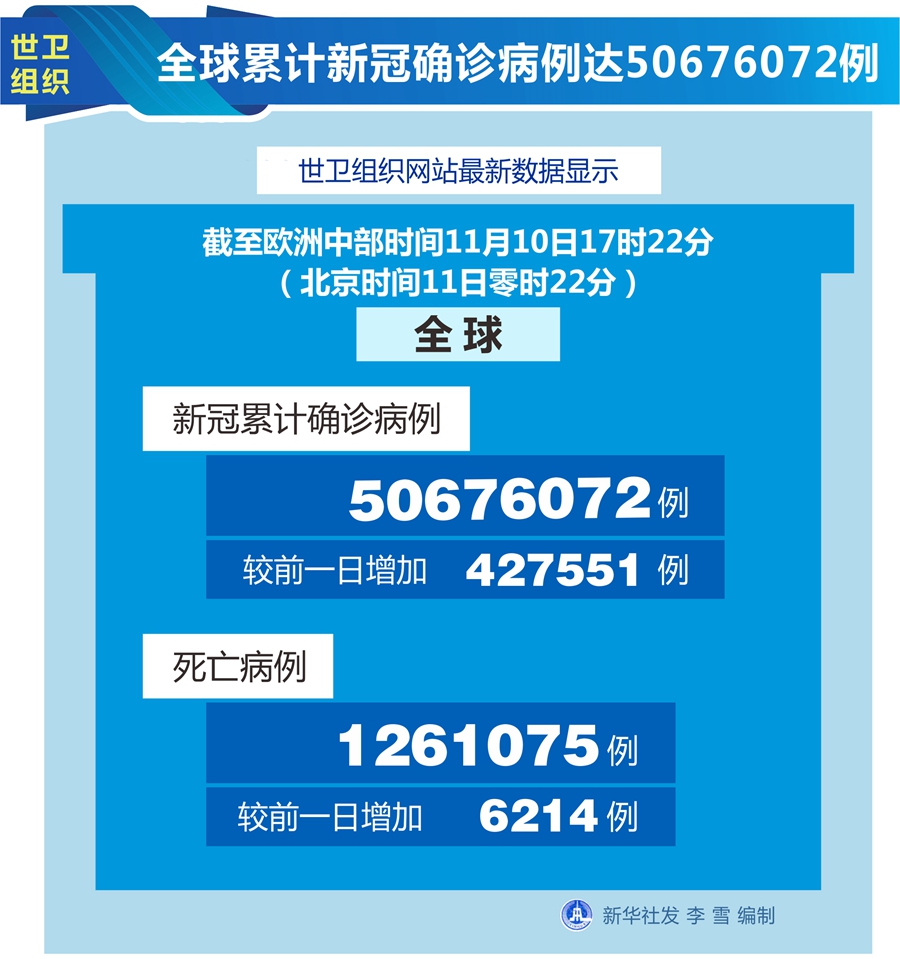 世衛(wèi)組織網(wǎng)站最新數(shù)據(jù)顯示,截至歐洲中部時(shí)間10日17時(shí)22分(北京時(shí)間11日零時(shí)22分),全球確診病例較前一日增加427551例,達(dá)到50676072例;死亡病例增加6214例,達(dá)到1261075例。