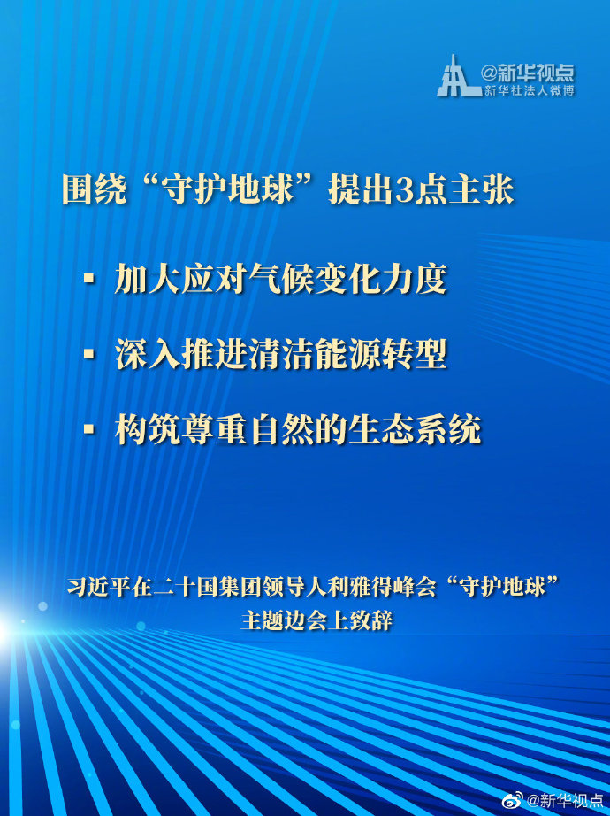 國家主席習(xí)近平11月22日在二十國集團領(lǐng)導(dǎo)人利雅得峰會“守護地球”主題邊會上提出3點主張。