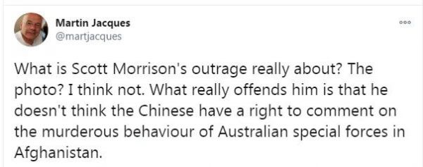 “莫里森的憤怒到底是什么?‘照片’?我想不是。真正令他惱怒的是,他認(rèn)為中國人無權(quán)對澳大利亞特種部隊在阿富汗的謀殺行為發(fā)表評論?!?/font>