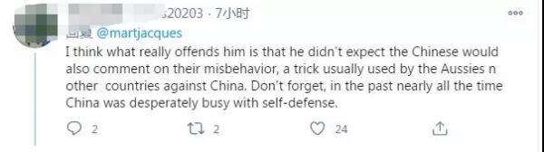 在這條推特下邊,許多網(wǎng)友為馬丁·雅克點贊。其中一位網(wǎng)友說道:“我認(rèn)為真正讓他惱火的是,他沒想到中國人也會對他們的不當(dāng)行為發(fā)表評論,這是澳大利亞人和其他國家對付中國的慣用伎倆。別忘了,在過去幾乎所有的時間里,中國都在拼命地進(jìn)行自衛(wèi)?!?/p>