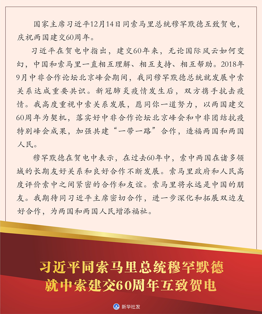 習(xí)近平同索馬里總統(tǒng)穆罕默德就中索建交60周年互致賀電