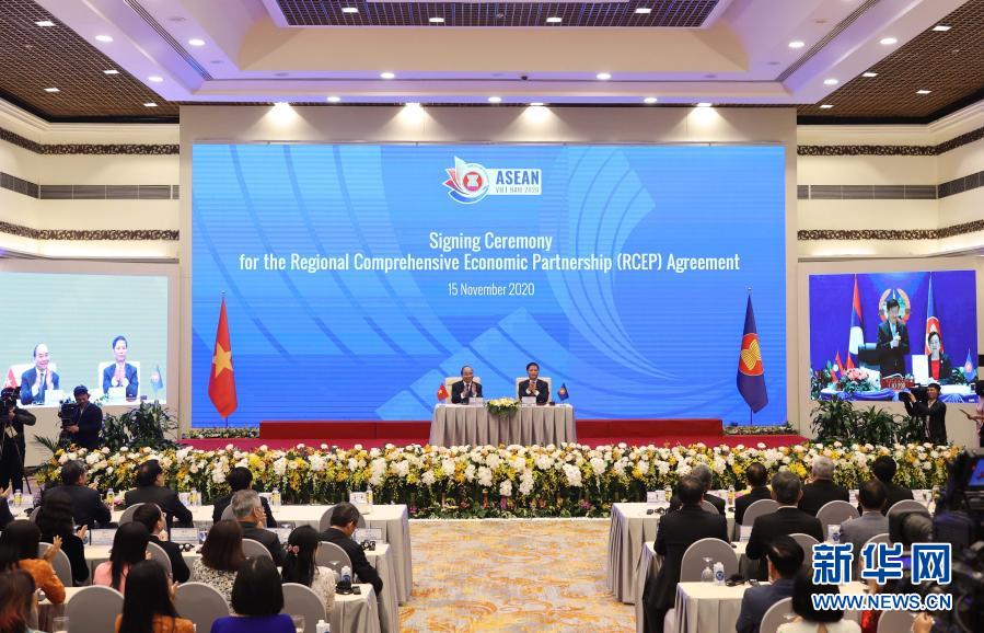 這是11月15日在越南首都河內(nèi)拍攝的區(qū)域全面經(jīng)濟(jì)伙伴關(guān)系協(xié)定(RCEP)簽署儀式現(xiàn)場。新華社/越通社