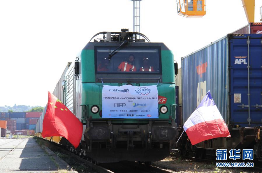 6月23日,滿載防疫物資的中歐班列抵達(dá)法國巴黎東南郊的瓦朗通,此次班列是中法首趟抗疫物資專列。新華社記者 徐永春 攝?