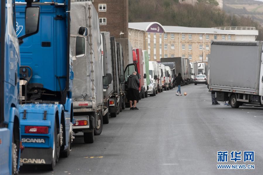 12月22日,在英國多佛,貨車因多佛港關(guān)閉在外排隊(duì)。新華社發(fā)(雷伊·唐攝)