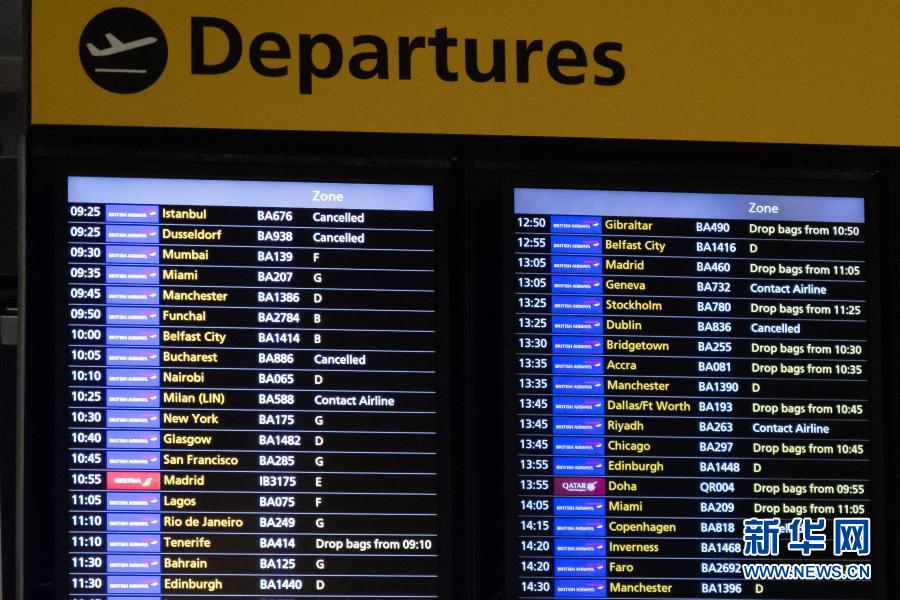 12月21日,英國倫敦希思羅機(jī)場第五航站樓內(nèi)顯示多趟航班被取消。新華社發(fā)(蒂姆·愛爾蘭攝)