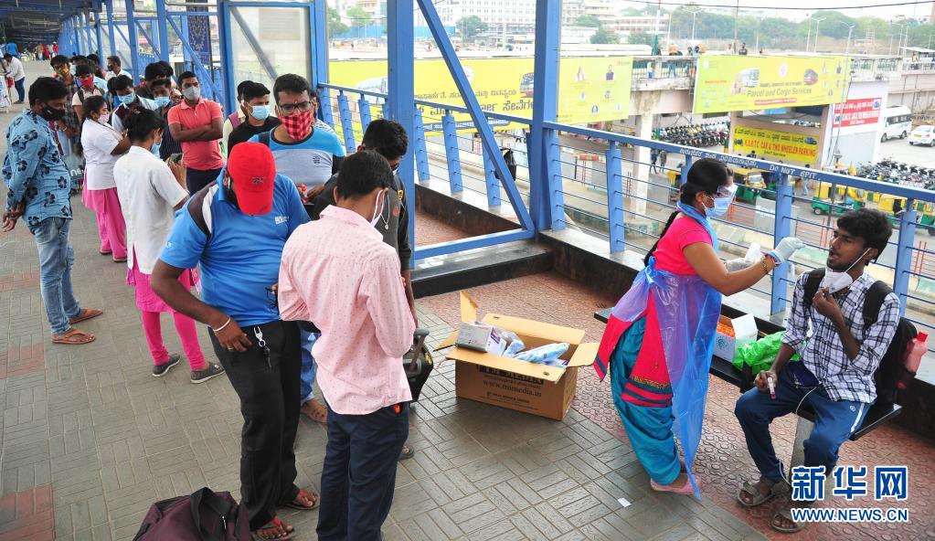 4月11日,一名男子在印度班加羅爾的一個公交站接受新冠病毒檢測取樣。