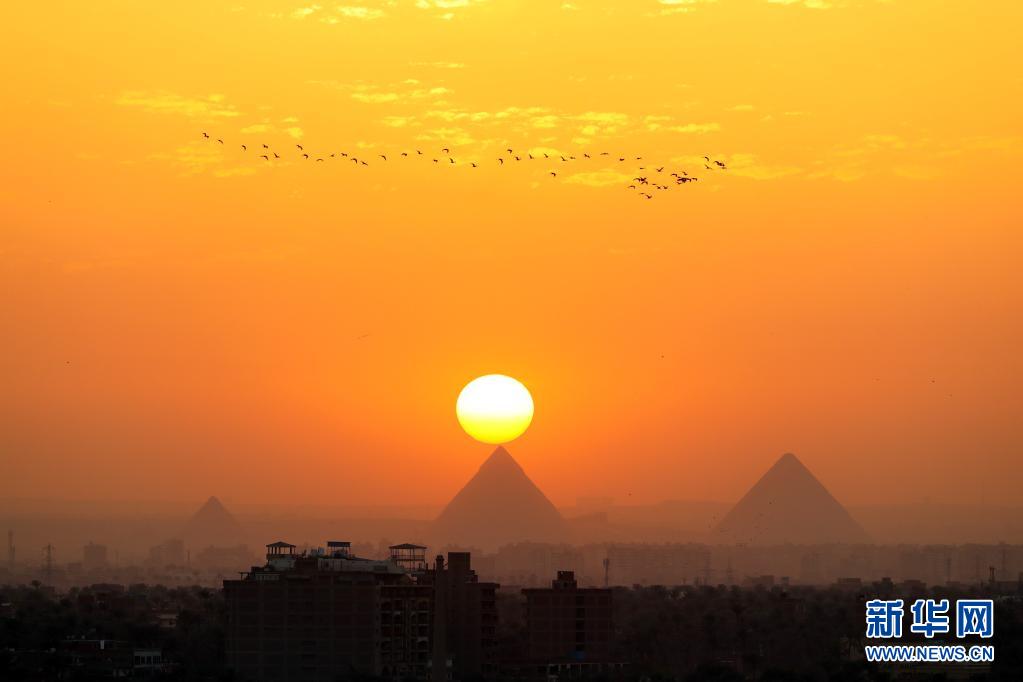 這是4月14日從埃及開(kāi)羅拍攝的吉薩金字塔群日落景色。新華社記者 隋先凱 攝