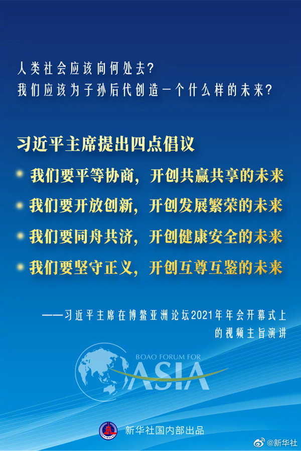 博鰲亞洲論壇2021年年會(huì)開幕式20日上午在海南博鰲舉行,國家主席習(xí)近平以視頻方式發(fā)表主旨演講。面對(duì)“人類社會(huì)應(yīng)該向何處去?我們應(yīng)該為子孫后代創(chuàng)造一個(gè)什么樣的未來?”這一重大命題,習(xí)近平主席提出四點(diǎn)倡議。