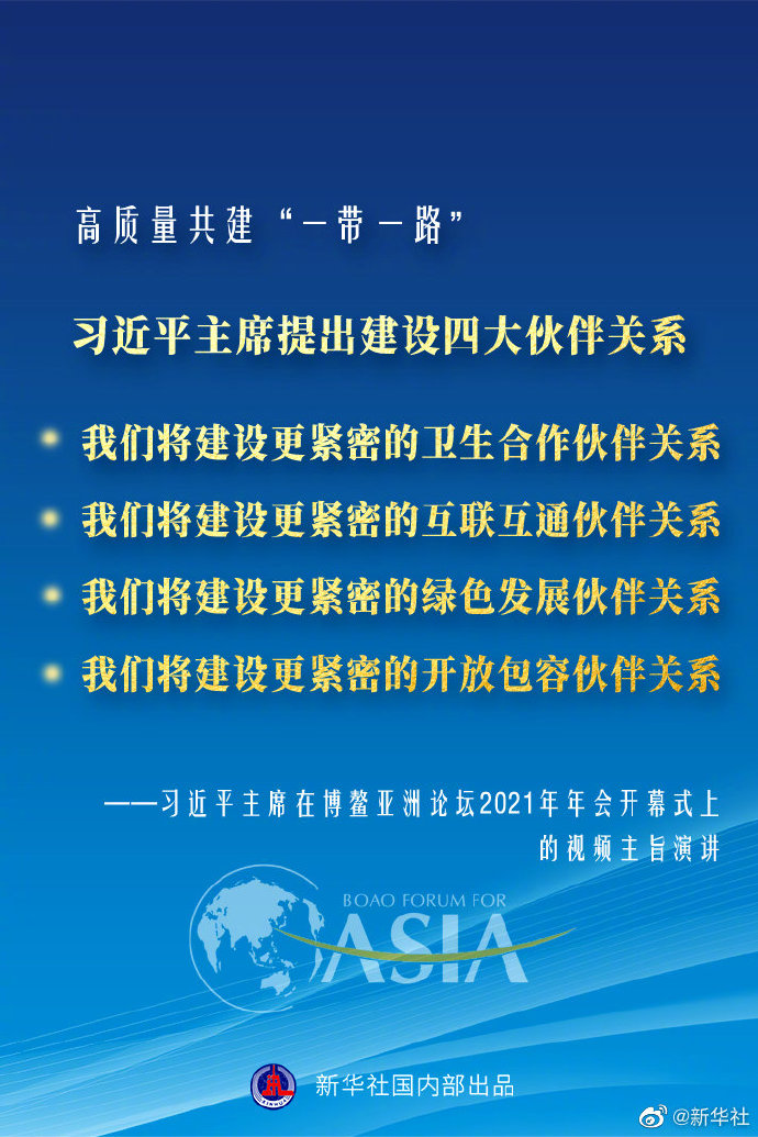 博鰲亞洲論壇2021年年會(huì)開(kāi)幕式20日上午在海南博鰲舉行,國(guó)家主席習(xí)近平以視頻方式發(fā)表主旨演講。針對(duì)高質(zhì)量共建“一帶一路”,習(xí)近平主席提出建設(shè)四大伙伴關(guān)系。 ?????