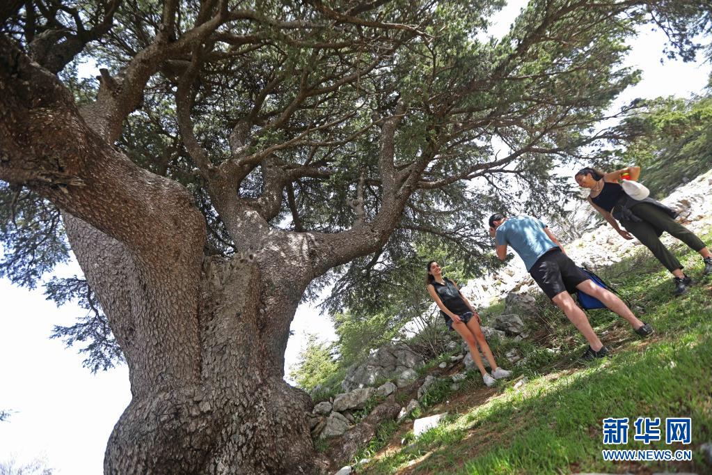 4月18日,游人在黎巴嫩巴魯克雪松保護區(qū)內游覽。