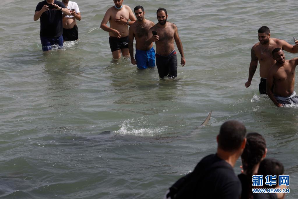 4月20日,在以色列北部城市哈代拉的海邊,鯊魚從人們身邊游過。