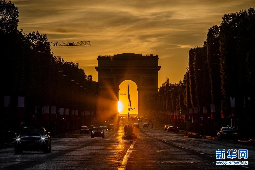 這是5月8日在法國巴黎香榭麗舍大街拍攝的凱旋門落日景象。