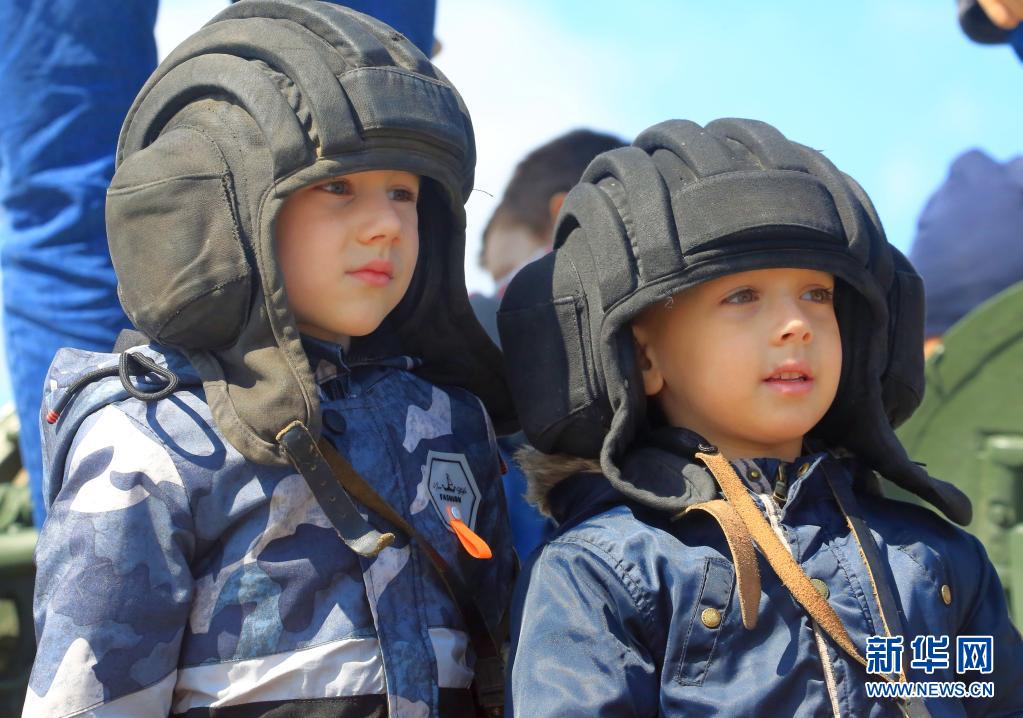 5月9日,在白俄羅斯首都明斯克,參加勝利日節(jié)慶活動的兒童頭戴二戰(zhàn)時(shí)期軍用頭盔。