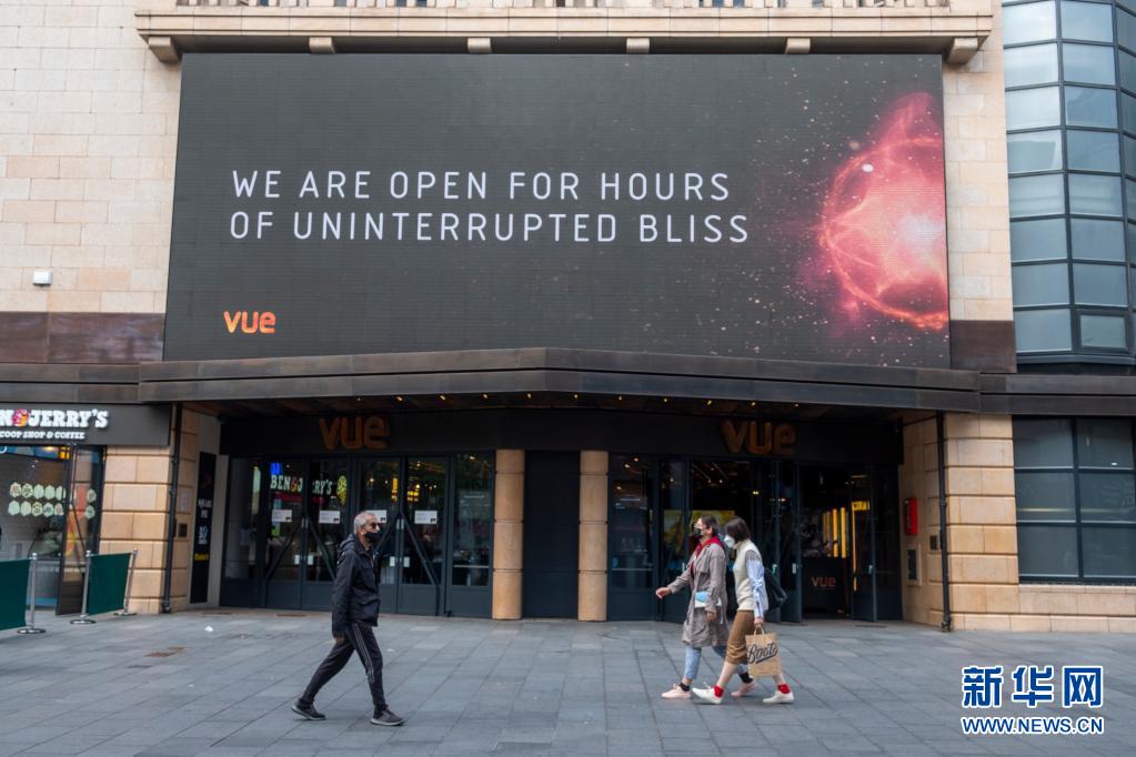 5月17日,人們從英國(guó)倫敦一家重開(kāi)的電影院門(mén)前走過(guò)。