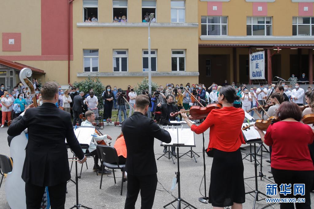當(dāng)日,羅馬尼亞首都布加勒斯特一個(gè)樂(lè)隊(duì)在該國(guó)一家傳染病醫(yī)院——馬太·巴爾什醫(yī)院演出,向抗擊新冠疫情的醫(yī)務(wù)工作者致謝。