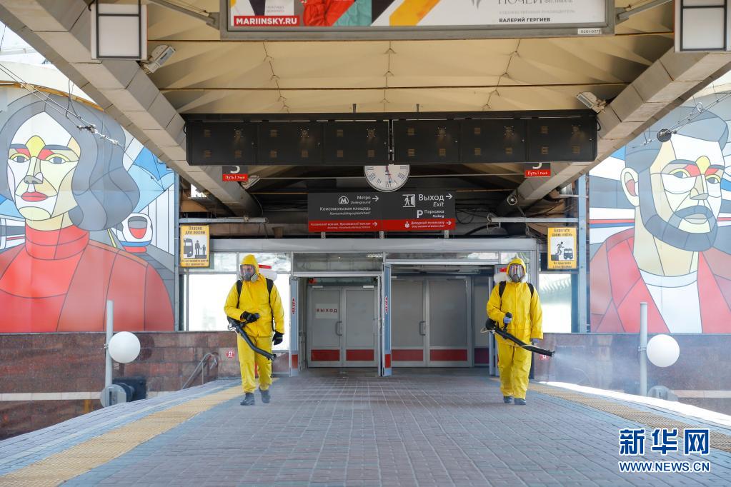 6月24日,工作人員身著防護服在俄羅斯莫斯科一個火車站進行消毒作業(yè)。