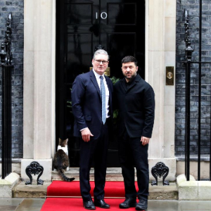 12月8日,在英国伦敦唐宁街10号首相府前,英国首相斯塔默(左)与乌克兰总统泽连斯基合影。新华社记者李颖摄
